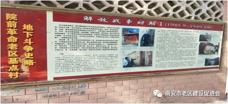 革命老区基点村院前村位于南(安)同(安)交界处的扬子山麓。1932年,中共晋南边地区的党员干部吴复基等到院前发展革命群众,成立一个活动小组,在石井、水头、莲河一带进行革命活动。1937年春,成立中共院前小组,组长黄永妙。1940年3月成立中共院前支部,李虹任书记。抗日战争时期,党支部组织抗日武工队、少年儿童团,开展抗日救国和民主斗争,活动范围发展到东安上、同安下、锦堂等8个村。1944年秋,李虹被国民党杀害,支部由李金配领导,继续开展地下斗争。1948年,成立中共南同边区院前支部,书记李开通。解放战争时期,该村游击队参加攻打安海,破坏了国民党的交通、桥梁、电杆、电话线;围攻水头田管处,攻打国民党驻水头特务机关、延平乡公所;参加袭击向沿海逃窜的国民党警察部队,配合人民解放军解放水头、同安等地,为革命作出了积极的贡献。