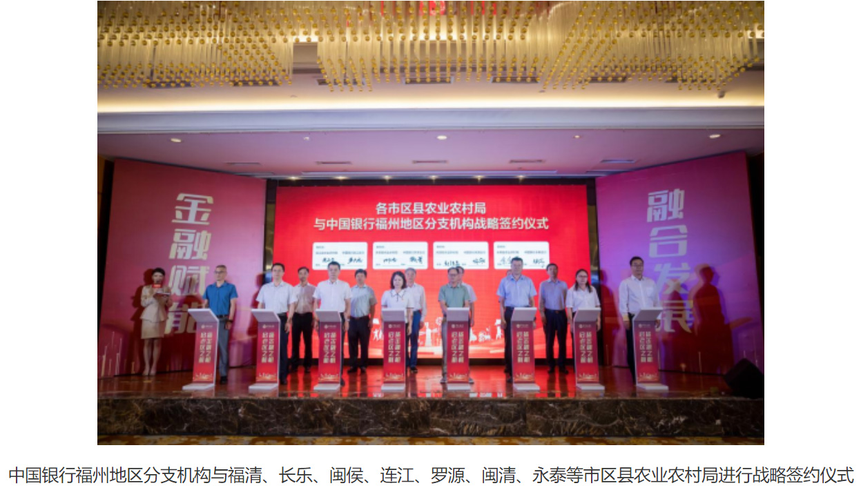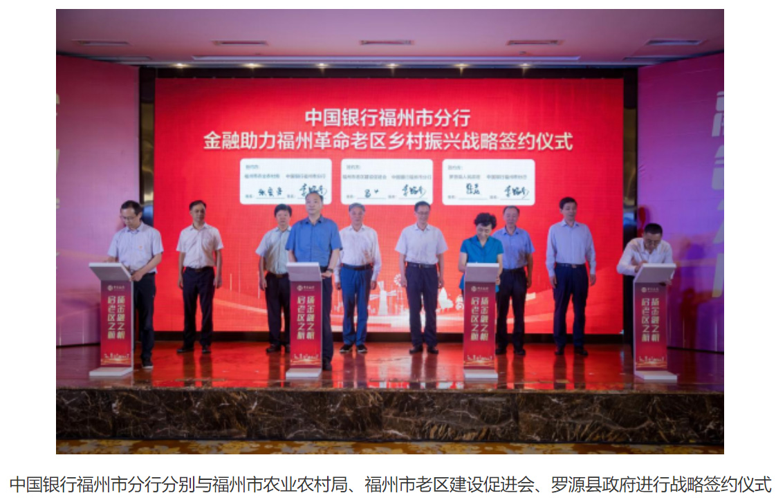 启动仪式上,中行福州市分行分别与福州市农业农村局、福州市老区建设促进会、罗源县政府进行战略签约;中行福清分行、闽侯分行、长乐支行等7家在榕分支机构分别与7家革命老区农业农村局签订支持乡村振兴战略合作协议,就全面推进乡村振兴、助力老区发展建设等开展深入合作。根据协议,中国银行将为福州市农业农村各项事业提供不低于300亿元人民币的意向性融资支持与金融场景支持,开启金融助力老区乡村振兴发展新篇章。